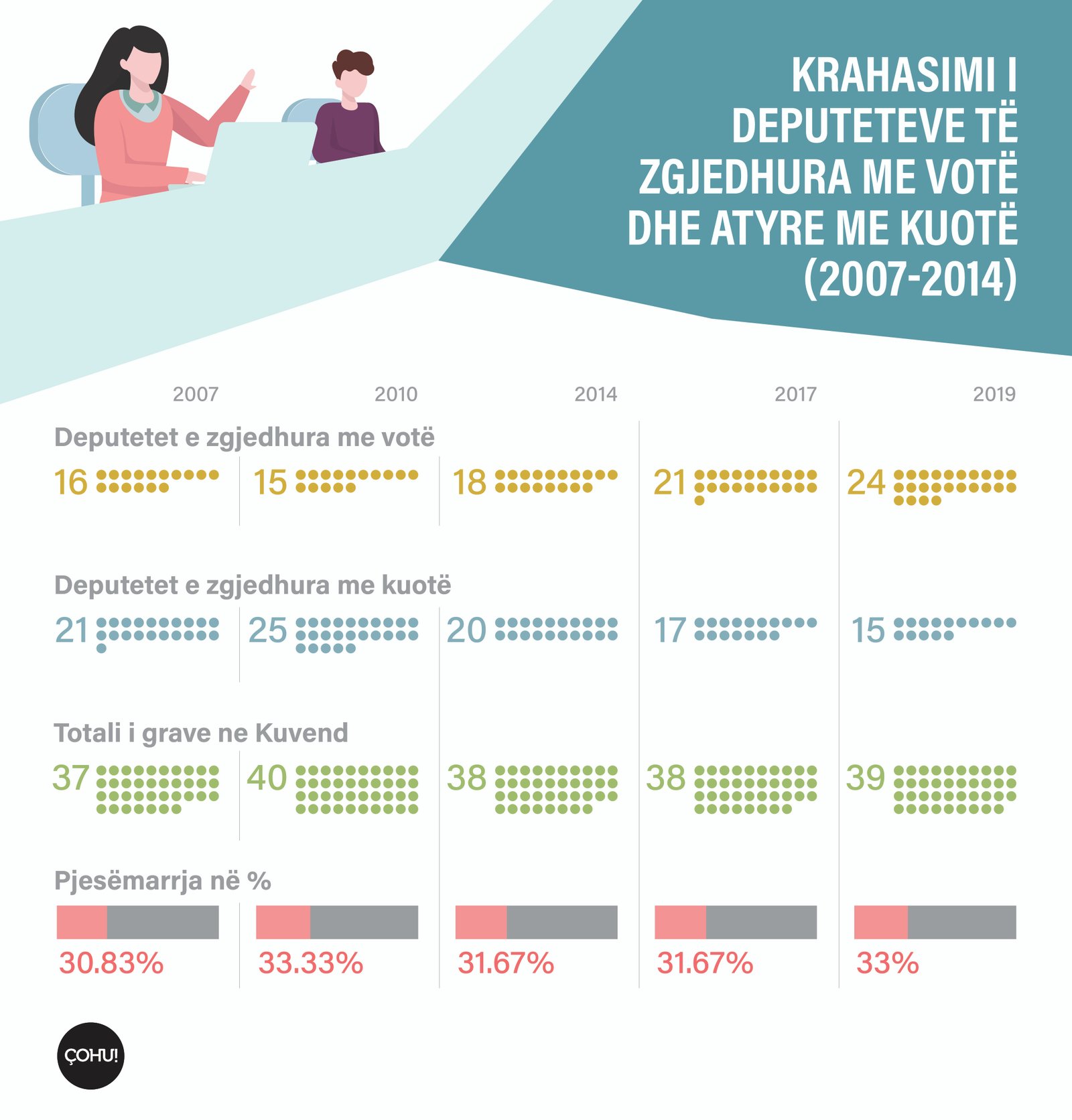 Në bazë të rezultateve të pesë palë zgjedhjeve të analizuara nga Preportr, shihet se numri i grave që kanë fituar pozitën e deputeteve pa ndihmën e kuotës është rritur ndër vite. Përderisa në zgjedhjet e vitit 2007 ishin vetëm 16 gra që ishin zgjedhur pa kuotë, në zgjedhjet e vitit 2019 numri i tyre është rritur në 24.