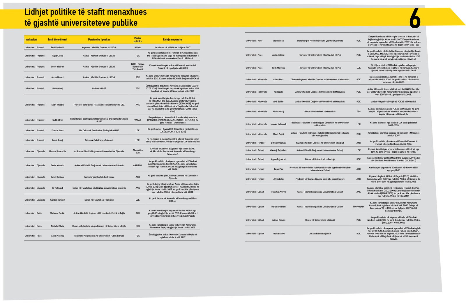 Të dhënat tregojnë se 35 persona prej këtyre që mbajnë këto pozita në 6 universitete dalin të jenë pjesë e partive politike. 15 janë të PDK-së, 6 të LDK-së, tre të AAK-së, pesë të AKR-së, dy të NISMA-s, një të Koalicionit Vakat, një të KDTP-së, një të Alternativës.